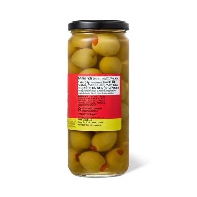 The Queen-Size Spanish Olives from market pantry™ are perfect for adding an extra dash of savory flavor to any dish. The jar contains juicy green, whole Spanish olives that are pitted and pimiento-stuffed for a burst of flavor. The queen-size olives make a welcome addition to any salad, vegetable platter, sandwich or drink. These ready-to-eat olives are also great on their own as a snack or simple appetizer, and they can even be added to your martini for a classic cocktail.